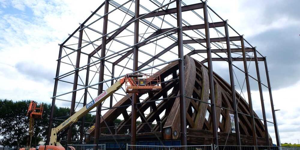 Voor de renovatie van de iconische Krúsrakbrug over de N7 bij Sneek hebben wij de constructieve berekeningen en tekeningen verzorgd van de tijdelijke loodsconstructie die rondom de brug is gebouwd. Deze tijdelijke loods, een 21 meter hoge, 800 m² grote geïsoleerde werkruimte, is essentieel om de brug droog en goed te kunnen renoveren. In de loods worden de temperatuur en luchtvochtigheid strak gereguleerd, zodat het hout van de brug optimaal gedroogd kan worden. Zie ook: Groot Sneek